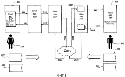 На фиг.1 изображена примерная операция инициирования сеанса, при которой пользователь 100 (например, Алиса) клиента 102 SIP хочет инициировать сеанс связи с другим пользователем 400 (Бобом) по сети связи, которая может включать в себя Интернет, интрасеть, глобальную сеть, локальную сеть, виртуальную частную сеть и т.п. С этой целью клиент 102 SIP постоянно находящийся на компьютерной системе 104, посылает сообщение 500 с запросом INVITE, которое идентифицирует Боба в качестве предполагаемого получателя. В контексте связи по стандарту SIP клиент 102 SIP, который посылает сообщение 500 INVITE для инициирования сеанса, упоминается как «вызывающий абонент», и клиент 402 SIP на компьютерной системе 404 Боба упоминается как «вызываемый абонент». Как определено в SIP, клиент 102 SIP также называется «клиентом агента пользователя» («КАП»), так как он создает новый запрос, и клиент 402 SIP также называется «сервером агента пользователя» («САП»), так как он генерирует ответ 600 на запрос 500 SIP.