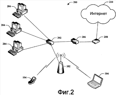 Фиг.2 является иллюстрацией системы беспроводной связи множественного доступа согласно одному или большему количеству вариантов осуществления. Изображена система 200, которая включает в себя БЛС, связанную с проводной локальной сетью (ЛС). Точка 102 доступа может осуществлять связь с мобильными устройствами 104. Точка 102 доступа соединена с концентратором или коммутатором 202 Ethernet для ЛС. Концентратор 202 Ethernet может быть соединен с одним или большим количеством электронных устройств 204, которые могут включать в себя персональные компьютеры, периферийные устройства (например, факсимильные аппараты, копировальные устройства, принтеры, сканеры и т.д.), серверы и т.п. Концентратор 202 Ethernet может быть соединен с маршрутизатором 206, который передает пакеты данных к модему 208. Модем 208 может передавать пакеты данных к глобальной сети (ГС) 210, такой как Интернет. Система 200 иллюстрирует одну простую конфигурацию сети. Возможно множество дополнительных конфигураций системы 200, включающих в себя альтернативные электронные устройства. Хотя система 200 проиллюстрирована и описана в отношении ЛС, система 200 может использовать другие технологии, включающие в себя БГС и/или ПБС или отдельно, или одновременно.