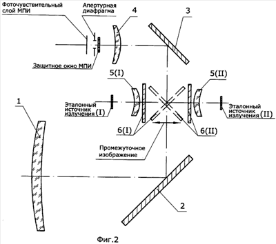 ИКС с двумя системами эталонного ИК излучения (фиг.2) содержит объектив 1, первое плоское зеркало 2, второе плоское зеркало 3, проекционный объектив 4, апертурную диафрагму и МПИ.