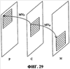 Фиг.29 иллюстрирует векторы компенсации движения между текущим кадром и предыдущим кадром MVP и текущим кадром и следующим кадром MVN.