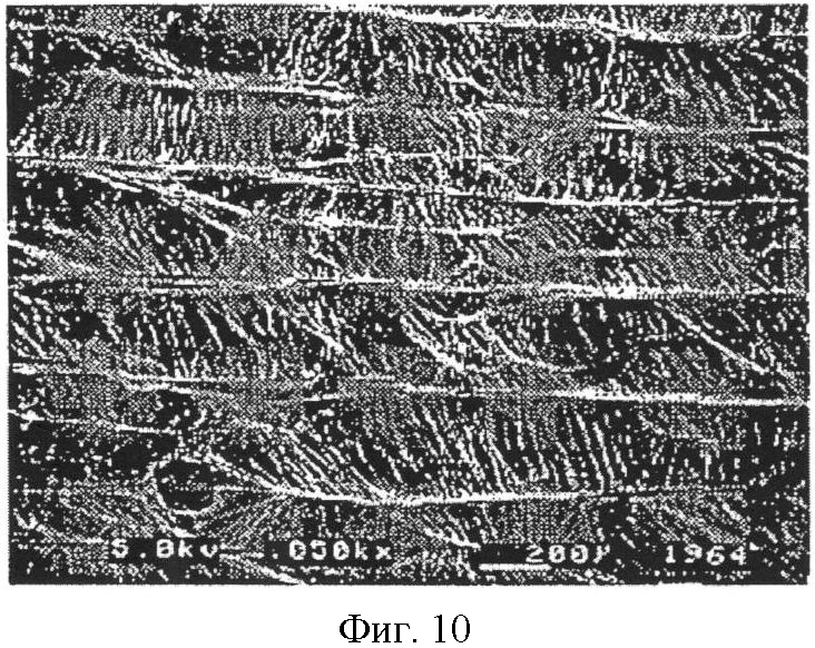 Является наиболее предпочтительным, если мембранный фильтрующий слой будет включать ПТФЭ. Подходящие мембраны из ПТФЭ описаны в патенте US 5814405. Мембраны, описанные в данной публикации, обладают хорошей фильтрационной эффективностью, высоким уровнем пропускаемости воздушного потока, а также имеют хороший показатель прочности на разрыв. Фиг.10 показывает изображение, полученное сканирующим электронным микроскопом, взятое из упомянутого патента и использованное в данной публикации, чтобы показать пример микроструктуры, описываемой в данном случае мембраны из ПТФЭ. Как может быть видно, микроструктура мембраны состоит из серии утолщений, соединенных друг с другом при помощи фибрилл (тонких волоконец), где утолщения главным образом располагаются параллельно друг другу, являются сильно вытянутыми, а отношение их длины к диаметру составляет 25:1 или более. Считается, что такие длинные утолщения микроструктуры помогают предотвращать любые расщепления мембраны во время процесса складывания фильтра, что предотвращает опасность образования точечных отверстий в мембране.