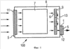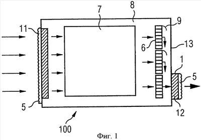 Фиг.1 схематично изображает вентиляторное охлаждающее устройство 100, в котором располагаются электронные компоненты, такие как, к примеру, электронные схемы, усилители, полупроводники и т.п., которые обозначаются как единый комплекс под номером 7. Благодаря одному или большему количеству вентиляторов 6, установленных на задней стенке 13 корпуса 8, образуется поток воздуха, направление перемещения которого обозначается при помощи стрелок. Количество вентиляторов зависит от величины корпуса 8 и компонентов 7, которые подлежат охлаждению. Пригодные для использования вентиляторы 6 являются осевыми и радиальными вентиляторами. Воздушный поток проходит через впускное отверстие 11 для воздуха (отверстие впуска воздуха), попадая внутрь корпуса 8, и выходит из корпуса 8 на противоположной стороне через выпускное отверстие 12 для воздуха (отверстие выпуска воздуха). Впускные и выпускные отверстия 11, 12 плотно закрыты защитным закрывающим элементом 1, который представляет собой водонепроницаемый пористый материал, так что воздух, подаваемый вентилятором 6, может попадать внутрь корпуса лишь исключительно через защитный закрывающий элемент 1 и, таким образом, он будет фильтроваться, проходя через фильтрующий материал 3. Защитный закрывающий элемент 1 может быть опционально расположен как внутри, так и снаружи корпуса 8, как схематично изображено на фиг.1. Пластина 5 в виде панели с прорезями располагается снаружи перед защитным закрывающим элементом 1 и служит для защиты его от механического повреждения, вандализма и от брызг воды. Воздух, предпочтительно, нагнетается внутрь через всю переднюю поверхность корпуса 8, проходит между электронными компонентами 7 и направляется за вентиляторы 6 при помощи отклоняющих пластин 9 к выпускному отверстию 12. Отклоняющие пластины 9 помогают соединить поток воздуха, направив его в углы корпуса, а затем направляют горячий воздух к выпускному отверстию 12. Типичный размер корпуса 8 базовой станции или распределительного щита телекоммуникационных устройств, воздвигаемых снаружи помещений, равен 1500×1000×1000 мм3 (В×Ш×Г), в то время как размер защитного закрывающего элемента 1, к примеру, равен 1000×450×1000 мм3 (В×Ш×Г). Размеры зависят от размера корпуса 8 и количества воздуха, подлежащего перемещению.