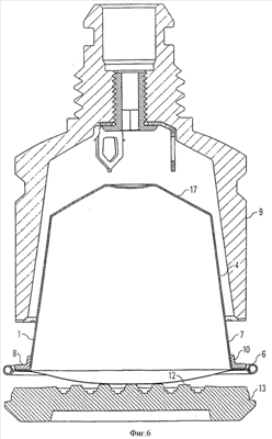 Наклонная отходящая уплотняющая поверхность 15 колоколообразного элемента 9 предназначена для взаимодействия с упруго изгибаемым уплотняющим элементом 8 капсулы 1. Наклон уплотняющей поверхности противоположен наклону свободной эластичной кромки, составляющей уплотняющий элемент.