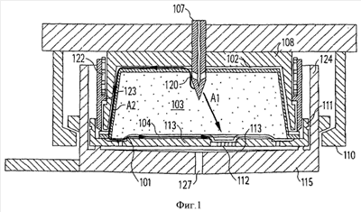 Ингредиенты в капсуле создают «бутылочное горлышко» на пути потока воды и поэтому могут стать причиной перепада давлений между верхней и нижней частью жидкости, протекающей через капсулу, и этот перепад давлений будет даже возрастать во время взаимодействия между жидкостью и ингредиентами, например, в связи с набуханием ингредиентов. Соответственно, необходимо обеспечить, чтобы вода фактически текла только через внутреннюю часть капсулы (стрелка А1) и чтобы вода не могла попасть из инжектора воды в промежуток между кольцеобразным ограждающим элементом 108 и внешней частью капсулы 101 и затем в выпускное отверстие 127 аппарата. Стрелка А2 показывает этот нежелательный внешний маршрут потока воды. Иначе говоря, любой поток воды с внешней стороны капсулы должен быть остановлен (или, по меньшей мере, удержан в значительной степени) контактом уплотнения, расположенным в промежутке между кольцеобразным элементом 108 и капсулой 101, и на маршруте потока между инжектором воды и выпускающим напиток отверстием. В варианте конструкции изобретения согласно предшествующей технологии, показанном на фиг.1, такой контакт уплотнения может быть достигнут посредством защемляющего зацепления между кольцеобразным элементом 108, ободом в виде фланца на боковой стенке капсулы 101 и держателем капсулы.