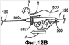Для ориентации опорной полки 112 в соответственно выбранном направлении для дальнейшего, как можно более глубокого входа в положение сцепления со складкой 340 закупорки 320, сначала фиксируют механизм 540 фиксации стержня и механизм 560 фиксации проволоки. Затем управляющее устройство 500 бурава удерживают рукой, как показано ex vivo на фиг.12В, и кольцевой выступ 532 поворачивают в заданном направлении, например, большим пальцем Т, для поворота стержня 130 вместе с дугой 110 и опорной полкой 112. При зафиксированных как механизме 560 фиксации проволоки, так и механизме 540 фиксации стержня можно поворачивать кольцевой выступ 532 в любом направлении и поступательно перемещать стержень 130 в дистальном направлении, как показано ех vivo на фиг.12В, соответственно, стрелками А и R.