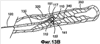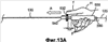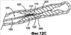 Поскольку проволока 120 остается зафиксированной на месте, в то время как стержень 130 вынуждается к дистальному поступательному перемещению, и узел 122 приложения усилия остается в положении упора в опорную полку 112, то упругая дуга 110 принуждается к аркообразному сгибанию радиально наружу и дальше от проволочного направителя 120, как показано на фиг.13В. Заметно, что, как показано на фиг.3, опорная полка 112 изогнута под косым углом относительно спинки 117 дуги, из-за чего узел 122 приложения усилия сначала контактирует с опорной полкой 112 в четко заданной точке Р, показанной на фиг.3, где прилагаются начальные изгибающие моменты. Кроме того, рельефный участок 114 образует место, в котором дуга 110 будет начинать изгибаться и принимать аркообразную форму.