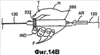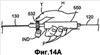 Для дальнейшего проникания в закупорку 320 узел 122 приложения усилия должен продвинуться дистально для контакта со вновь вскрытым участком складки 340 и внедрения в него. С этой целью, как показано ex vivo на фиг.14А, кольцевой выступ 532, предварительно отжатый на расстояние D, показанное на фиг.13А, теперь захватывают между большим пальцем Т и указательным пальцем IND. Затем другие пальцы F разжимают для освобождения захвата рукоятки 550 для проволоки ладонью руки Н, как показано ex vivo на фиг.14В. Тем самым энергия, накопленная в аркообразной дуге 110, высвобождается для проталкивания опорной полки 112 в дистальном направлении, показанном стрелкой AR, пока рукоятка 550 для проволоки не придет в упор с кольцевым выступом 532.