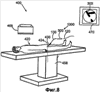 На фиг.8 изображена типичная операционная 400, используемая для операции с буравом 1000 для прохождения закупорок, которая содержит операционный стол 458, аппарат 468 визуализации и дисплей 470, который предоставляет в реальном времени изображение проходящего лечение сосуда 300. В примерном варианте осуществления, когда осуществляют лечение коронарной артерии 300, пациента 420 укладывают в положение, лежа на стол 458, и стержень 130 проводят через катетер 430, который входит в пациента 420 через разрез 424 в бедренной артерии 428, как показано на фиг.9.