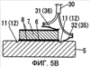 В ультразвуковом преобразователе 1 согласно этому осуществлению раструб 5 имеет форму плоской пластины. Ультразвуковой вибратор 4 расположен на плоской поверхности раструба 5, который также имеет вогнутый паз 12 и тот или иной контакт из пары электрических контактов для запитывания ультразвукового вибратора 4 через раструб 5 и клей 6. Электрический контакт раструба 5 расположен у плоской поверхности раструба 5 снаружи вогнутого паза 12, окружающего ультразвуковой вибратор 4. Согласно Фиг.5В: электрический контакт раструба 5 вводится в упругий контакт с металлическим упругим телом 35 – клеммой 32 для электропитания от вывода 30. Поэтому в электродах 8 ультразвукового вибратора 4: электрод 8, соединенный с раструбом 5, электрически соединен с металлическим упругим телом 35 через раструб 5 и клей 6. Аналогично, металлическое упругое тело 36 используется в качестве клеммы 31 для источника электропитания, соединенного с другим электродом 8. Этот электрод 8 вводится в упругий контакт с металлическим упругим телом 36 непосредственно.