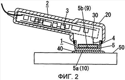 Если потеки клея доходят до электрического контакта, находящегося в упругом контакте с металлическим упругим телом 35, то эти потеки нарушат контакт. Но согласно этому осуществлению, поскольку вытекание клея вокруг вогнутого паза 12 ограничено, эту проблему можно устранить. Раструб 5 в виде плоской пластины изготавливается легче, чем раструб 5 в форме цилиндра с дном согласно Фиг.1В и 4А, и этот раструб компактный. Даже если используется раструб 5 в форме плоской пластины, один электрический контакт можно расположить на плоской поверхности раструба 5 вне вогнутого паза 12. Раструб 5 в форме плоской пластины имеет преимущество обеспечения точности таких размеров, как толщина, плоскостность и т.д.
