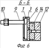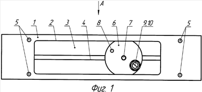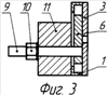 На периферии диска 6 образована, например, пара сквозных отверстий 8, имеющих разный диаметр, например, от 5 до 8 мм. В одном из этих отверстий крепится конец первого крепежного средства, выполненного, например, в виде резьбовой шпильки 9, на другом конце которой установлено второе крепежное средство, выполненное, например, в виде гайки 10 (фиг.2).