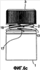 4. Колпачок по п.1, отличающийся тем, что он содержит первую линию (8) разрыва и вторую линию (9) разрыва, отделенные друг от друга в осевом направлении таким образом, что они вместе образуют вытягиваемое кольцо, образующее упомянутую полосу (13); причем первая линия (8) разрыва проходит по винтовой траектории, и два ее конца перекрывают друг друга и находятся на небольшом расстоянии друг от друга в осевом направлении на коротком участке (16) перекрытия, образуя разрушаемую перемычку (17) между двумя перекрывающимися концами; вторая линия (9) разрыва также проходит по винтовой траектории, и два ее конца перекрывают друг друга и находятся на небольшом расстоянии друг от друга в осевом направлении на коротком участке (18) перекрытия, образуя разрушаемую перемычку (19) между двумя перекрывающимися концами; так что когда крышку (3) отвинчивают впервые, первая и вторая линии (8, 9) разрыва разрушаются, образуя полосу (13) в виде вытягиваемого кольца, которое остается прикрепленным посредством разрушаемых перемычек (17, 19) к крышке (3) и/или к нижнему краю предохранительного пояска (4), удерживаемому в цилиндрической втулке (1).