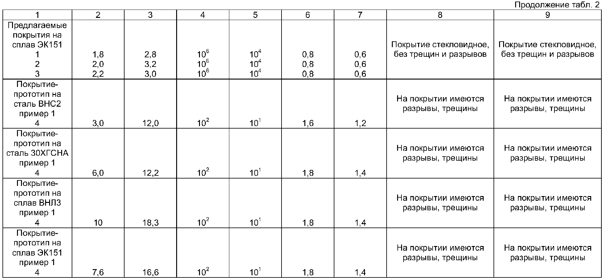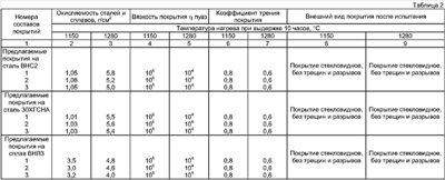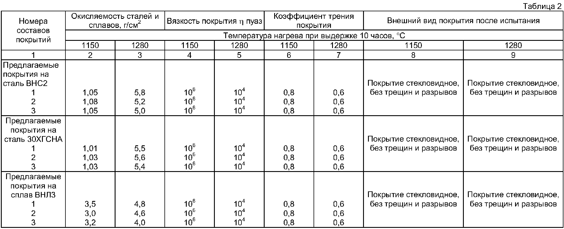 Авторами экспериментально установлено, что введение 2BaO·3SiО2, 2Аl2О3·В2О3 в предлагаемое покрытие при заявленном содержании и соотношении компонентов повысило вязкость и жаростойкость, снизило коэффициент трения покрытия при термической и горячей обработке сталей и сплавов. Рентгеноструктурный анализ предлагаемого защитного технологического покрытия показал, что в процессе технологических нагревов в покрытии образуются температуроустойчивые фазы BaO·Al2О3·2SiО2, 3Al2О3·2SiО2 и 9Аl2О3·2В2О3, обеспечивающие повышение вязкости и снижение коэффициента трения защитного технологического покрытия при высоких температурах 1280°С. Примеры осуществления Пример 1. Для получения фритты защитного технологического покрытия компоненты покрытия в соответствующих мас.% (таблица 1) Аl2О3 – 3, СаО – 13, MgO – 5,5, В2О3 – 18, К2О – 0,1, ВаО – 13, 2BaO·3SiО2 – l, 2Аl2О3·В2О3 – 1, SiO2 – 44,4 помещали в фарфоровый барабан с алундовыми шарами в соотношении 1:1,5. Размол и перемешивание компонентов проводили в течение 3 часов на валковой мельнице. Варку фритты проводили в камерной печи. Затем получали шликер покрытия, который выгружали в полиэтиленовую емкость. После этого замеряли вязкость шликера вискозиметром В3246 и из краскораспылителя наносили на образцы сталей ВНС2, 30ХГСНА и сплавов ВНЛ3 и ЭК151. Вязкость шликера покрытия составляла 21 с, толщина покрытия 0,5 мм. Образцы с покрытием подвергали сушке при 20°С, затем проводили термическую обработку. Примеры 2, 3, 4 получения защитных покрытий осуществляли аналогично примеру 1. Составы предлагаемого защитного технологического покрытия и покрытия-прототипа приведены в таблице Образцы сталей ВНС2, 30ХГСНА и сплавов ВНЛ3, ЭК151 с предлагаемым защитным технологическим покрытием и покрытием-прототипом подвергались испытаниям на окисляемость, вязкость и коэффициент трения покрытия при высоких температурах 1150°С и 1280°С. Окисляемость образцов с защитным технологическим покрытием определялась путем непрерывного взвешивания без извлечения образцов из печи при заданных температурах. Вязкость покрытия определялась методом вдавливания иглы в покрытие под нагрузкой 5 г при постепенном нагревании образца с покрытием. По глубине проникновения иглы в покрытие по диаграмме вязкости рассчитывалась вязкость покрытия. Коэффициент трения покрытий, определяющий эффективность защитных покрытий как высокотемпературных смазок при горячей обработке давлением, определялся методом замера коэффициента трения при горячей деформации при осадке образцов d – 5 мм, h – 20 мм на гидравлическом прессе мощностью 2,5 т со скоростью 80 мм/с. На образце после деформации замеряли величину двойного угла трения и определяли величину коэффициента трения по формуле µ=tg Результаты сравнительных испытаний, приведенные в таблице Окисляемость сплавов ВНЛ3, ЭК151 с предлагаемым защитным покрытием при технологических нагревах при температуре 1150°С (выдержкой 10 ч) меньше соответственно в 2,86 и в 4,22 раза, а при температуре 1280°С (выдержкой 10 ч) меньше в 3,81 ив 5,93 раза по сравнению с покрытием-прототипом. Вязкость предлагаемого защитного покрытия на сталях ВНС2, 30ХГСНА при технологических нагревах 1150°С и 1280°С в течение 10 ч больше соответственно в 3 и 4 раза по сравнению с покрытием-прототипом. Вязкость предлагаемого защитного покрытия на сплавах ВНЛ3, ЭК151 при технологических нагрева