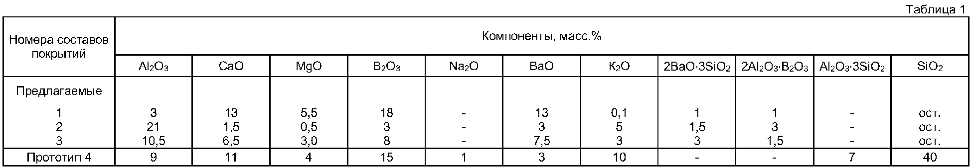 Защитное технологическое покрытие, включающие SiO2, Аl2О3, CaO, MgO, В2О3, BaO, К2О, отличающееся тем, что оно дополнительно содержит 2BaO·3SiO2, 2Аl2O3·В2О3 при следующем соотношении компонентов, мас.%: Аl2O3 – 3-21; CaO – 1,5-13; MgO – 0,5-5,5; В2O3 – 3-18; BaO – 3-13; K2O – 0,1-5; 2BaO·3SiO2 – 1-3; 2Аl2O3·В2O3 – 1-3; SiO2 – остальное.