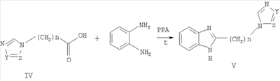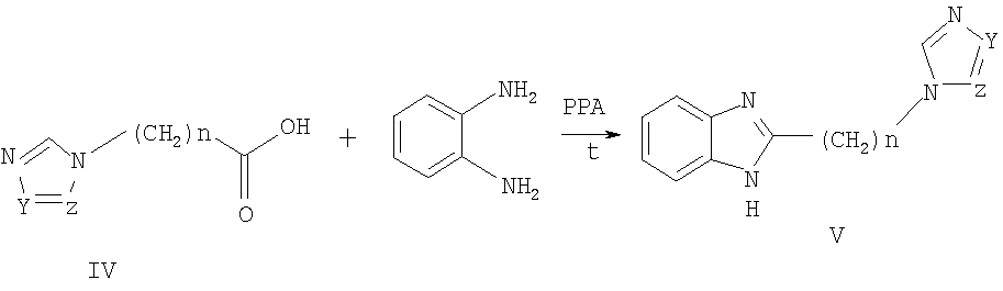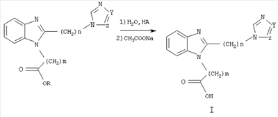 Согласно настоящему изобретению [2-(азол-1-ил)алкилбензимидазол-1-ил]алкановые кислоты общей формулы I получают алкилированием 2-(азол-1-илалкил)бензимидазолов общей формулы V, которые, в свою очередь, получают циклоконденсацией ( -(азол-1-ил)алкановых кислот общей формулы IV, где Z и Y означают атом азота или СН-группу, или одновременно являются цепью С-СН=СН-СН=СН-С, составляющую вместе аннелированное кольцо, n означает целое число от 1 до 3, с о-фенилендиамином в присутствии полифосфорной кислоты (РРА) при нагревании до 170-180°С.