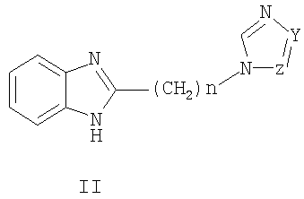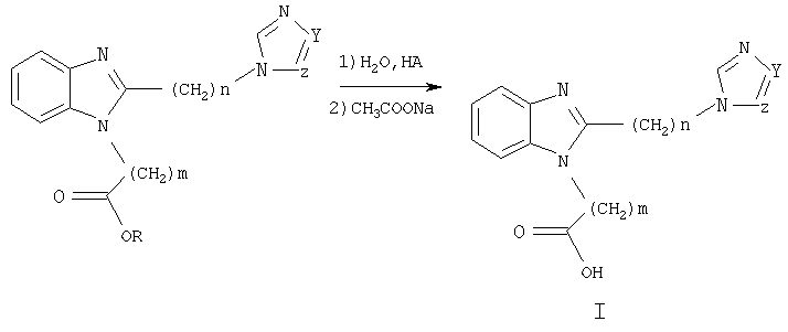 где Z и Y означают атом азота или СН-группу, или одновременно являются цепью С-СН=СН-СН=СН-С, составляющую вместе аннелированное кольцо, n и m одинаковые или разные означают целое число от 1 до 3, R означает атом водорода или алкильную группу с числом атомов углерода от 1 до 4, заключающийся в том, что 2-(азол-1-илалкил)бензимидазолы общей формулы II, где Z, Y и n имеют те же значения, что и в формуле I, алкилируют эфирами -галогеналкановых кислот общей формулы III, где m означает целое число от 1 до 3, R имеет те же значения, что и в формуле I, Hal означает атом галогена,