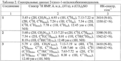 Аналогично получают другие 2-(азол-1-ил)алкилбензимидазолы. (Таблица 1).