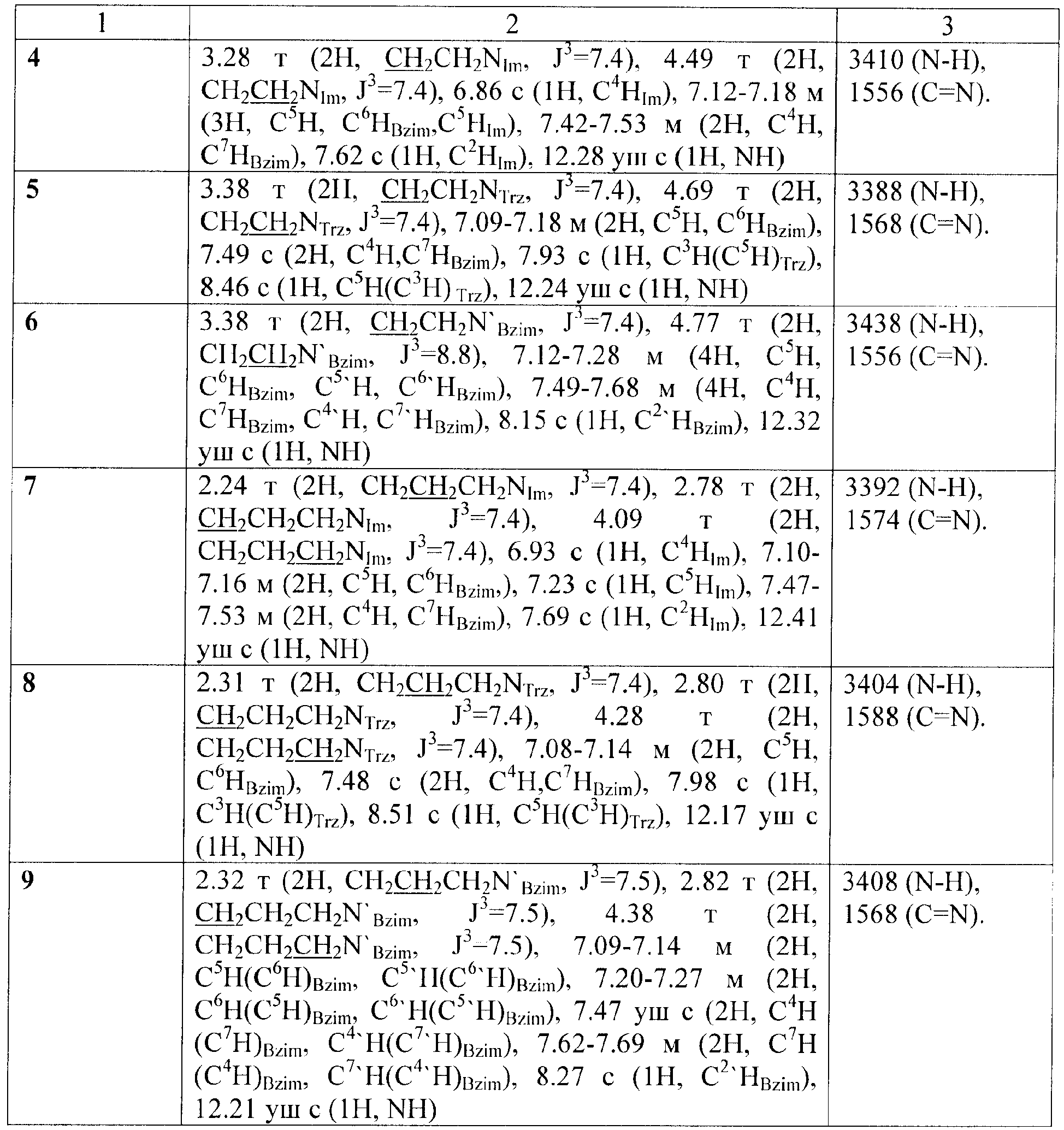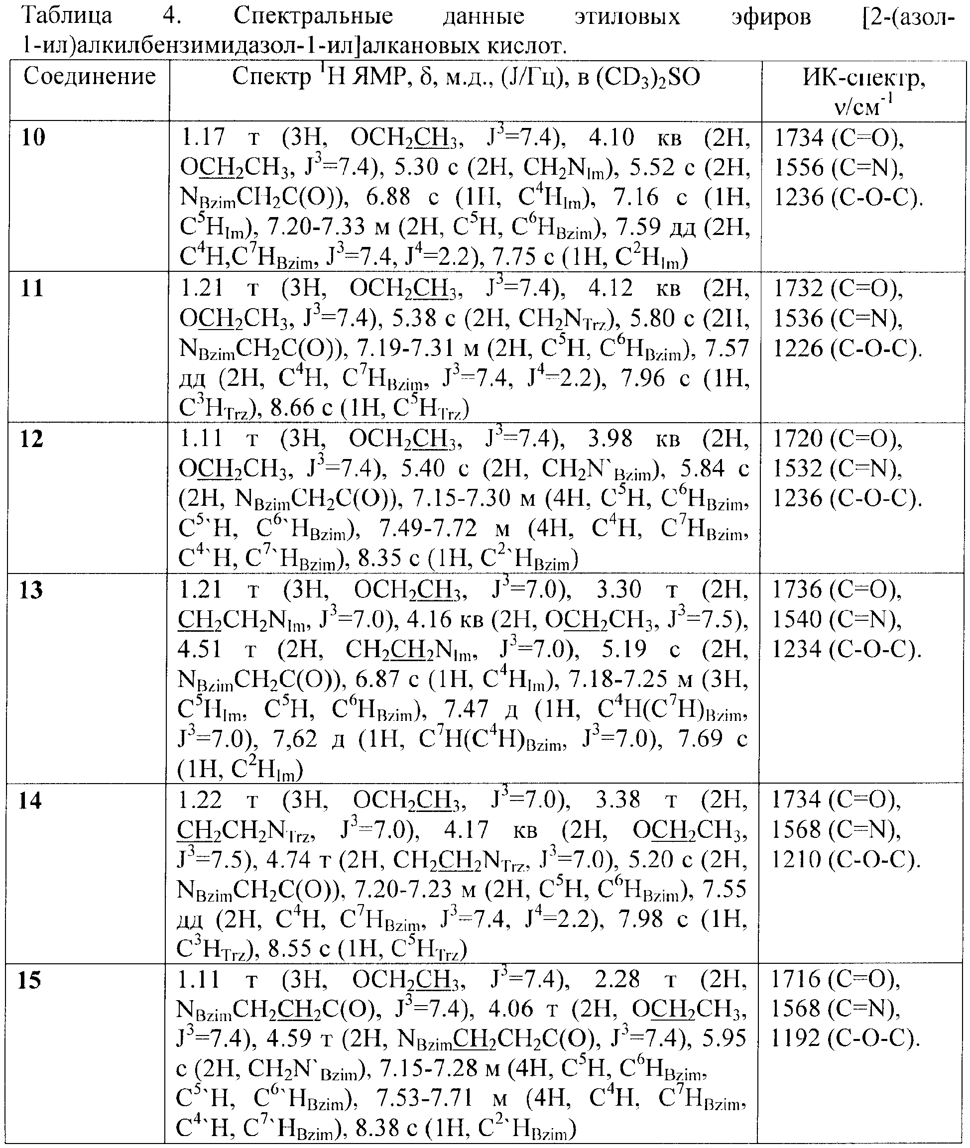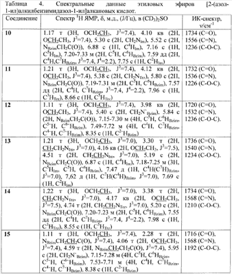 Данные о выходе и температуре плавления полученных этиловых эфиров [2-(азол-1-ил)алкилбензимидазол-1-ил]алкановых кислот приведены в таблице 3, спектральные характеристики – в таблице 4.