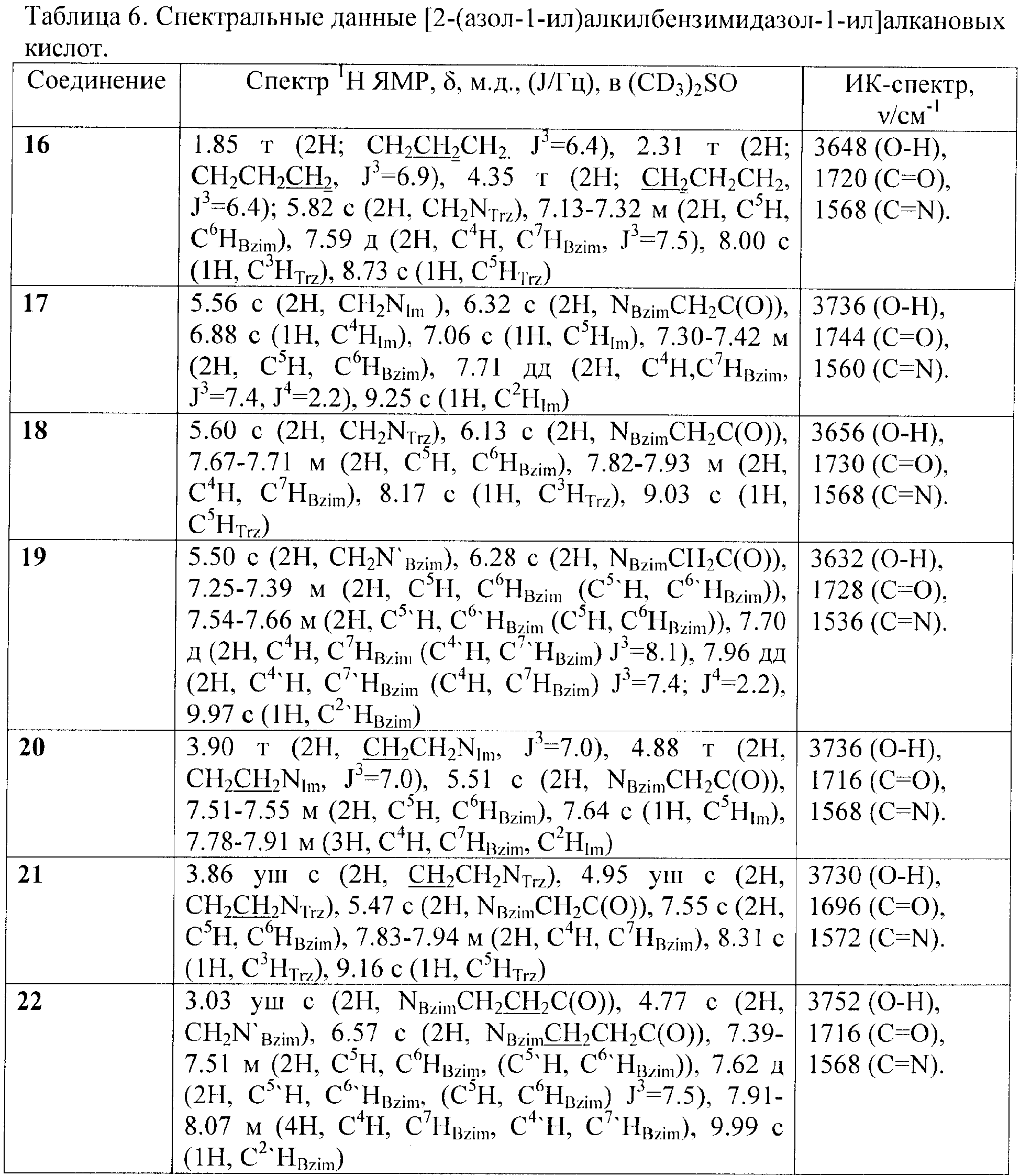 Данные о выходе и температуре плавления полученных [2-(азол-1-ил)алкилбензимидазол-1-ил]алкановых кислот приведены в таблице 5, спектральные характеристики – в таблице 6.