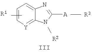 Наиболее близки к заявляемой структуре соединения общей формулы III [патент США 4563455, МКИ С07D 401/06, заявл. 9.03.1984, опубл. 7.01.1986], обладающие противоязвенной активностью, где А означает низшую алкильную группу, R1 означает атом водорода, галогена, низшую алкильную группу или низшую алкоксигруппу, R2 означает атом водорода, низшую алкильную группу, циклоалкил, пиридил или арил, R3 означает азотсодержащую ненасыщенную гетероциклическую группу, Y означает атом азота или СН-группу, которые получают взаимодействием о-фенилендиамина с соответствующими кислотами в присутствии различных конденсирующих агентов, например N,N’-дициклогексилкарбодиимида, тионилхлорида, оксохлорида фосфора, этилхлорформиата и др.