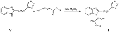 По другому методу эфиры [2-(азол-1-ил)алкилбензимидазол-1-ил]алкановых кислот общей формулы I (способ Б) получают алкилированием 2-(азол-1-илалкил)бензимидазолов общей формулы V эфирами ( -галогеналкановых кислот в апротонных полярных растворителях, например ацетонитриле, метилэтилкетоне, ДМФА и др., в присутствии карбонатов щелочных металлов и катализаторов межфазного переноса: краун-эфиров, четвертичных аммонийных оснований и т.п при нагревании до температуры 60-120°С.
