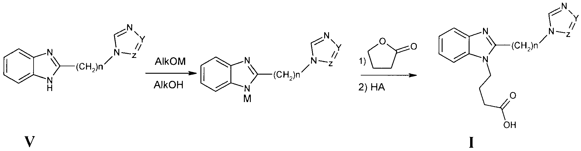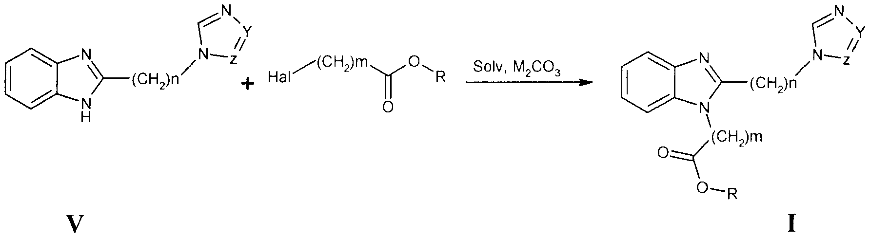 Далее 2-(азол-1-илалкил)бензимидазолы общей формулы V подвергают алкилированию различными алкилирующими агентами. Для получения эфиров [2-(азол-1-ил)алкилбензимидазол-1-ил]алкановых кислот общей формулы I, где Z и Y означают атом азота или СН-группу, или одновременно являются цепью С-СН=СН-СН=СН-С, составляющую вместе аннелированное кольцо, n и m одинаковые или разные означают целое число от 1 до 3, R означает низшую алкильную группу с числом атомов углерода от 1 до 4, по способу А в качестве алкилирующих агентов используют эфиры ( -галогеналкановых кислот, где m означает целое от 1 до 3, R означает низшую алкильную группу с числом атомов углерода от 1 до 4, Hal означает атом галогена в апротонных полярных растворителях, например ацетонитриле, метилэтилкетоне, ДМФА и др., в присутствии карбонатов щелочных металлов при нагревании до температуры 60-120°С.