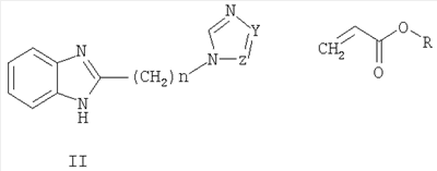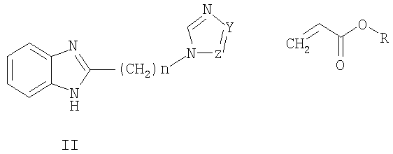 где Z и Y означают атом азота или СН-группу, или одновременно являются цепью С-СН=СН-СН=СН-С, составляющую вместе аннелированное кольцо, n означает целое число от 1 до 3, m=2, R означает атом водорода или алкильную группу с числом атомов углерода от 1 до 4, заключающийся в том, что 2-(азол-1-илалкил)бензимидазолы общей формулы II, где Z, Y и n имеют те же значения, что и в формуле I, алкилируют алкилакрилатом общей формулы IV, где R имеет те же значения, что и в формуле I,