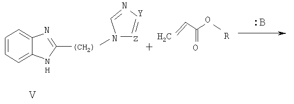 Для получения эфиров [2-(азол-1-ил)алкилбензимидазол-1-ил]алкановых кислот общей формулы I, где m=2, по способу В проводят алкилирование бензимидазолов общей формулы V избытком алкилакрилата, где R означает низшую алкильную группу с числом атомов углерода от 1 до 4, в отношении от 1:1 до 1:1,5 в низших алифатических спиртах в присутствии органических оснований, например триэтиламина, гидроксида тетрабутиламмония, 1,8-диазобицикло[5.4.0]-ундец-7-ена (ДБУ), в качестве катализаторов.