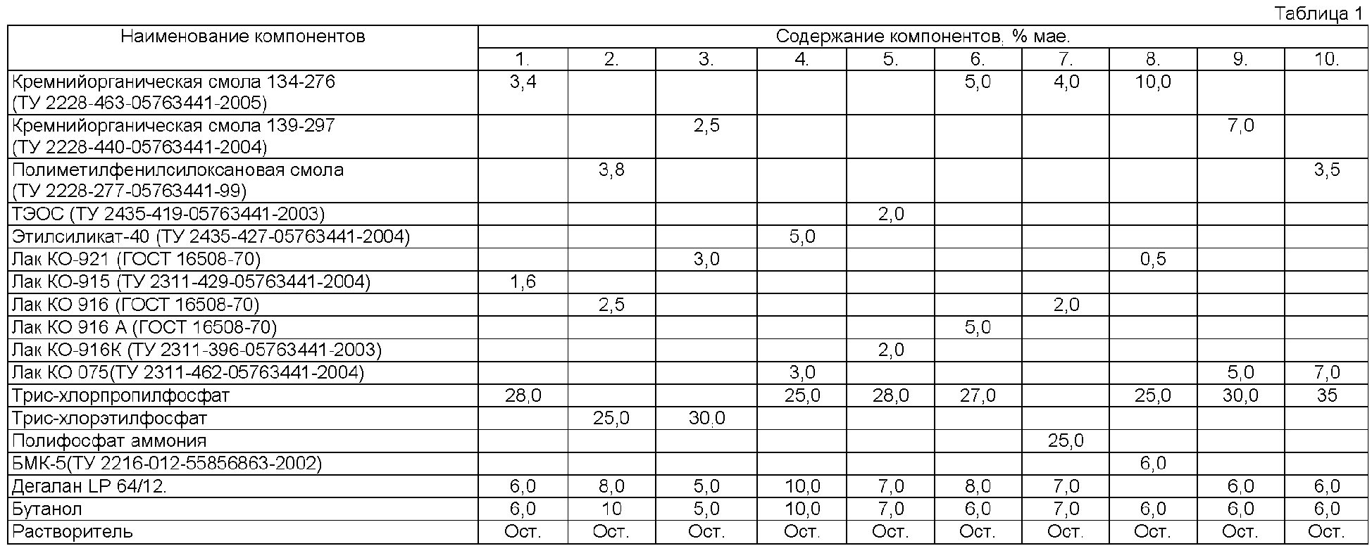 1812188, C08G 77/395, C09D 183/06, опубл. 1993). Данный состав позволяет получить покрытия со следующими показателями качества: твердость 0,47-0,64 усл. ед., адгезия 1-2 балла, влагостойкость 2-8 мас.% потеря массы при горении 10,3-23,04%, время самостоятельного горения 19,6-105,0 с.