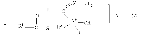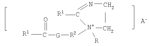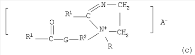 Примеры четвертичных соединений имидазолиния включают в себя: 1-метил-1-талловоиламидоэтил-2-олеилимидазолиний метилсульфат и 1-метил-1-олеиламидоэтил-2-олеилимидазолиний метилсульфат, где R1 представляет собой ациклическую алифатическую C15-C17 углеводородную группу, R2 представляет собой этиленовую группу, G представляет собой NH-группу, R5 представляет собой метальную группу и А– представляет собой метилсульфатный анион, коммерчески доступный от Degussa под товарными знаками Varisoft® 475 и Varisoft® 3690, соответственно.