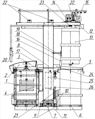 Транспортный робот 8 снабжен электроприводом 11 движения вдоль гальванической линии и электроприводом 12 для поперечного перемещения кабины 13, установленной на платформе 14, на которой смонтирован привод 15 для подъема-опускания деталей внутри кабины 13.