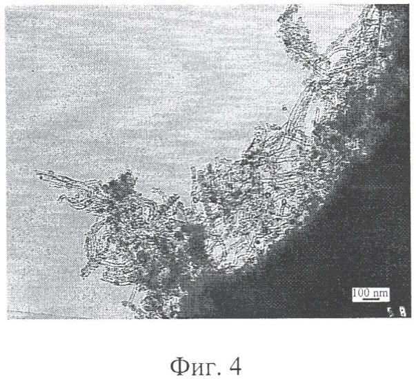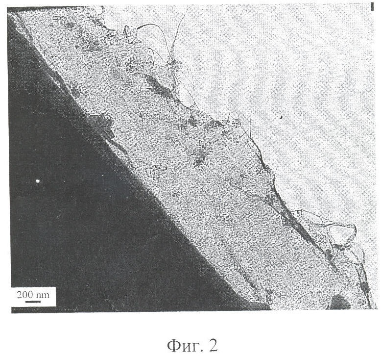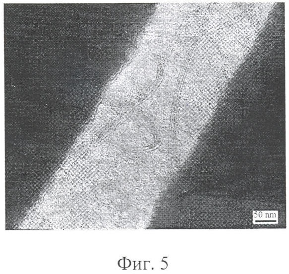 Полученные покрытия по данным просвечивающей электронной микроскопии представляют собой рыхлый “ковер” из многослойных нанотрубок толщиной до 200 нм при диаметре самих нанотрубок 5-40 нм (фиг.4) на углеродном волокне.