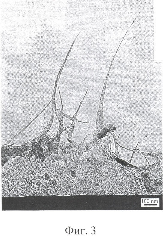 Полученные покрытия по данным просвечивающей электронной микроскопии представляют собой сплошной плотный “ковер” из многослойных нанотрубок толщиной от 40 до 100 нм при диаметре самих нанотрубок 2-6 нм (фиг.3) на углеродном волокне диаметром 7,5 мкм.
