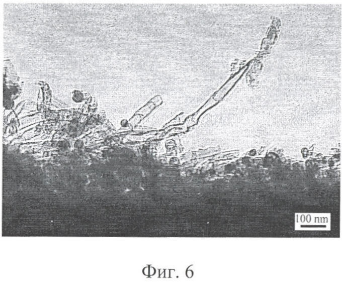 Полученные покрытия по данным просвечивающей электронной микроскопии представляют собой сплошной плотный “ковер” из многослойных нанотрубок толщиной от 40 до 100 нм при диаметре самих нанотрубок 2-6 нм (фиг.6) на углеродном волокне диаметром 7,5 мкм.