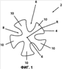 Соединительный элемент 2 может включать центральную часть 6, которая преимущественно является круглой в поперечном сечении, и лепестки 10, каждый из которых имеет наружную поверхность 4 и каждый из которых выступает из центральной части. В одном из вариантов осуществления изобретения соединительный элемент 2 имеет пять лепестков 10 и, соответственно, может быть назван пятилепестковой нитью. Соседние лепестки отделены друг от друга канавкой 8, имеющей определенную форму, например “С”-образную. Наружная поверхность 4 соединительного элемента 2 может иметь криволинейную форму, как, например, показано на фиг.1. По существу, можно считать, что соединительный элемент имеет в основном круглое поперечное сечение радиуса R. Расположение, размер и/или форма канавок 8 и лепестков 10 позволяет соединительному элементу 2 деформироваться при сжатии или растяжении.