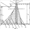 1. Объемный вес как водонасыщенных хвостов, так и объемный вес грунта естественной влажности плотины обычно близки к величине 2 т/м3. Если в первом приближении всю толщу намытых хвостов hx рассматривать как тяжелую жидкость, эпюра давления 28, то при высоте возведения плотины hn=hx активное давление на стенку со стороны хвостов примерно в 3-4 раза будет превышать активное давление грунта со стороны плотины, эпюра давления 29. По мере приобретения лежалыми хвостами структурной прочности их активное давление на стенку уменьшится, эпюра 30, но их пассивное сопротивление, что очень важно для устойчивости стенки 2, существенно увеличится, эпюра 31. Такое оценочное сопоставление позволяет сделать вывод о том, что в случае хвостохранилища общая устойчивость стенки 2 не вызывает сомнения. Однако ее устойчивость в верхней части для каждого яруса возведения должна быть исследована на предмет определения допустимой величины а (фиг.2) превышения уровня грунта плотины перед стенкой 2 над уровнем хвостов 4 с учетом конкретных условий, веса габионов qi и наличия анкерных элементов 32 (фиг.1). Устойчивость верхней части стенки 2 должна быть обеспечена относительно любого горизонтального сечения n-n, проведенного в пределах верхней части стенки.