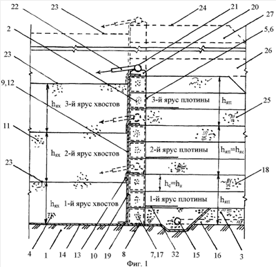 При таком поярусном возведении ограждающей плотины каждый раз ленту 12 сопрягают с нижерасположенной лентой 12 посредством нахлеста 13, а допустимое перед стенкой 2 превышение а (фиг.2) уровня грунта плотины над уровнем хвостов 4 для каждого яруса устанавливается проектом из условия устойчивости стенки 2. При этом наращивание грунтовой части плотины до ее конечного уровня 24 осуществляют с внешней стороны очередями: 25 – первая очередь и 26 и 27 – последующие очереди.