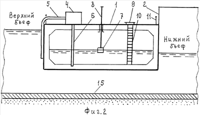 Затвор действует следующим образом. При закачке в понтон 1 забортной воды насосом 4 через трубы 5 и 6 понтон оседает вниз, а уровень воды в верхнем бьефе поднимается. При откачке же воды из понтона обратно за борт он поднимается вверх, а уровень воды в верхнем бьефе опускается. Насос 4 работает от электроэнергии, подаваемой от береговой сети. Уровень воды внутри понтона, где плавает поплавок 7, показывается на его штоке 8, имеющем сантиметровые деления. Подпор воды в верхнем бьефе увеличивает ее скорость течения под понтоном, но, благодаря бетонной плите 15, грунт под ней не размывается.