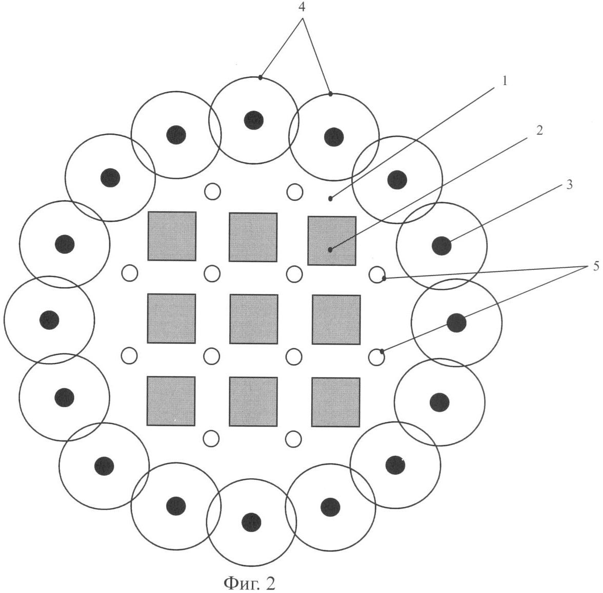 В грунте 1 параллельно сваям 2 по периферии укрепляемых свай 2 с шагом 0,5-2 м забивают инъекторы 3 на глубину предполагаемого уплотнения. Затем через инъекторы 3 подают твердеющий раствор под давлением, вызывающим гидроразрыв грунта. Подачу раствора продолжают до тех пор, пока соседние зоны уплотнения 4 не сомкнутся друг с другом. При этом в грунте возникают гидроразрывы с уплотнением и ликвидацией слабых участков. Поскольку инъекторы 3 располагаются вокруг свайного поля, а их принцип работы имеет ненаправленное действие, уплотнение вокруг каждого из них осуществляется в радиальном направлении более-менее равномерно, образуя зоны уплотнения грунта 4, по форме близкие к цилиндрическим. После затвердевания раствора по периферийному контуру укрепляемых свай образуется надежная завеса с перемятой структурой грунта, армированного уплотняющим раствором. Второй этап заключается в подаче раствора в зону, ограниченную контуром, в том числе и межсвайное пространство, которое осуществляется с помощью инъекторов 5. Сформированная завеса вокруг свайного поля позволяет инъектировать раствор под большим давлением. Максимальное давление определяется техническими возможностями применяемых высоконапорных насосов, способных в настоящее время развивать давление до 20 атмосфер и необходимой величиной повышения несущей способности. Созданная завеса позволяет повышать несущую способность как кустов свай, так и отдельно стоящих свай.
