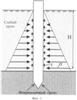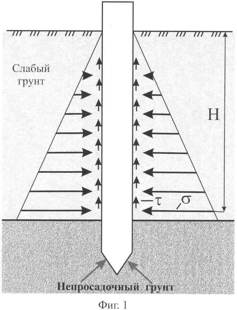 На фиг.1 показана такая свая. Она прорезает слабый грунт и своей подошвой опирается на расположенный ниже прочный грунт. Приложенная к ней вертикальная нагрузка уравновешивается реакцией грунта, действующей на заостренную часть нижнего конца сваи, и его сопротивлением, распределенным по боковой поверхности ее ствола =tg * (кулоновское трение, пропорциональное коэффициенту трения и нормальному обжатию в случае сыпучей среды). Из этого выражения следует, что свая может хорошо работать, если в слабом окружающем грунте создается необходимое уплотнение, повышающее коэффициент трения на контактной поверхности и нормальное боковое давление. Таким образом, эффективное повышение несущей способности сваи, окруженной слабым грунтом, может быть достигнуто за счет увеличения обеих компонент одновременно.