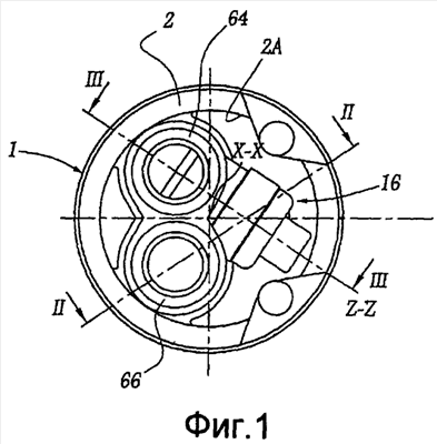 Основание 2 корпуса 1 своим нижним концом ограничивает полость 2A в целом цилиндрической формы с осью X-X, в которую помещается термостатический блок 16, детально описанный ниже. Полость 2A сообщается с внутренним объемом 6 тремя сквозными отверстиями, ограниченными основанием 2, а именно: