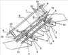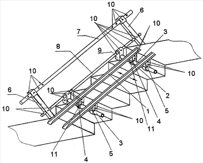 В нерабочем положении направляющие 1 и 2 сдвинуты к балке 8, причем направляющая 1 жестко зафиксирована относительно поперечин 3.