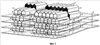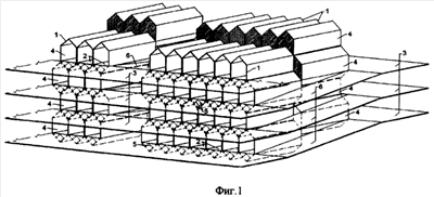 Соседние ярусы боксов 4 из полых правильных шестигранных призм смещены по горизонтали на половину ширины бокса (см. фиг.1, 3). Боксы могут быть установлены в 2 ряда глухими торцами друг к другу, причем ряды смещены вертикально на половину высоты бокса (см. фиг.1, 3). Таким образом, появляется перепад в пол-этажа, пандусы 6 входят в систему проездов (см. фиг.1, 2). Ширина плит перекрытия проезжей части принимается достаточной для обеспечения двухстороннего движения автомобилей, схема которого обозначена на фиг.2 стрелками.