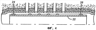 На фиг.3 показаны два расширенных участка трубчатого элемента 10, уже подготовленных для введения ремонтной накладки (гильзы) 22 с внешними уплотнениям 24 и 26. На заключительном шаге накладка расширяется до внутреннего диаметра 28, который предпочтительно по меньшей мере больше начального диаметра 30 ствола скважины. Накладка 22, как показано, представляет собой единую деталь, но может состоять и из нескольких секций. Процедура ремонта описана в отношении одного места в скважине, но может быть применена и во множестве положений внутри скважины. Хотя показана зацементированная колонна, предлагаемый способ применим и в отношении незацементированных труб.