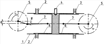 При положении поршня центрального КШМ в ВМТ (на чертеже справа) поршень дезаксиального КШМ (слева) находится в положении, когда кривошип повернут в направлении к НМТ на угол =15 30 °ПКВ. С этого момента оба поршня перемещаются в направлении к НМТ, и объем между поршнями увеличивается на порядок (и более) быстрее, по сравнению с увеличением объема в известных ДВС с двумя поршнями, одновременно перемещающимися от ВМТ. При организации процесса сгорания так, чтобы начало основной фазы примерно совпадало с положениями КШМ, показанными на чертеже (поршень центрального КШМ находится в ВМТ), длительность этой фазы можно сократить в несколько раз без увеличения жесткости сгорания по отношению к традиционным циклам.