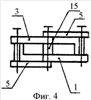 Свободные стороны пластин 3 и 1 с помощью немагнитных болтов 4 притянуты к немагнитным пластинам-дублерам 5, обеспечивающим прижим пластин 1 и 3 к источнику магнитного поля – кольцеобразному магниту 6. Пластина магнитопроводов, например пластина 3, снабжена рабочей катушкой 7, в которой наводится ЭДС от пассивных роторных элементов 8, укрепленных на лопастях ветроколеса (на фиг.1 не показано). Внутренний магнитопровод образован пластинами 9 и 10, укрепленными в угле немагнитным болтом 11 с дистанционной втулкой 15, аналогично внешнему магнитопроводу, показанному на фиг.4, а свободные концы пластин 9 и 10 стянуты с немагнитными пластинами 12 немагнитными болтами 13. Пластина 10 внутреннего магнитопровода также снабжена рабочей катушкой 14. Статор укреплен на основании (на чертеже не показано) с помощью тех же крепежных болтов. Основанием является дугообразная пластина, ориентированная в плоскости чертежа.