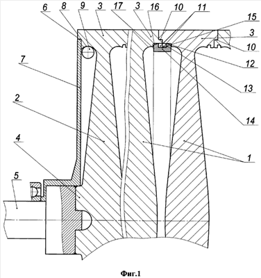 Составной маховик (фиг.1) собран из отдельных маховиков 1 и двух щек 2 по торцам составного маховика. Каждый маховик 1 и каждая щека 2 представляют из себя диск, по форме выполненный в виде так называемого диска равной прочности (такими выполняют, например, турбинные диски) – формы диска, выдерживающего наибольшие частоты вращения. По периферии маховика 1 и щек 2 расположены ободья 3, по ширине превышающие максимальную толщину диска равной прочности. Каждая из щек 2 с наружного торца выполнена с выступом 4, к которому крепится, например, сваркой или другим известным способом, цапфа 5.