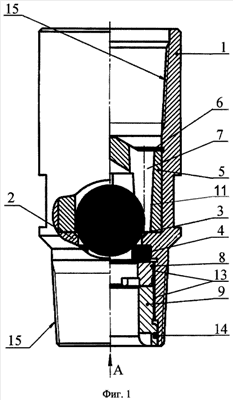 Седло 4 закреплено с помощью резьбовой гайки 8 и резьбовой втулки 9, снабженной пазами 10, под ключ (фиг.2). Для защиты резьбы 13 втулка 9 снабжена уплотнительным кольцом 14.
