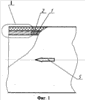 На фиг.3 схематически показана структура защитного слоя и образование этой структуры во время намотки трубы из композиционно-волокнистого материала. В продольном направлении армирующий материал уложен зигзагом 8, вершины каждой петли зигзага зафиксированы краевой нитью 9 на внутреннем диаметре и краевой нитью 10 на наружном диаметре защитного слоя. В структуре защитного слоя имеются также поперечные (кольцевые) нити 11.