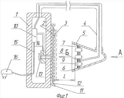 При включении в электрическую сеть с переменным напряжением 220 В с помощью преобразователя 16 подается постоянное напряжение 5 В на контроллер 10, соединенный проводами 15 и металлизационным рисунком 8 печатной платы 7 с выводами разноспектрального источника света 9, например светодиодов, которые при подаче на них управляющих напряжений от контроллера 10 включаются по специальной программе в различных комбинациях. Свет, излучаемый разноспектральными источниками света 9, с помощью основного полого отражателя 5, покрытого зеркальной пленкой 6, направляется на дополнительный отражатель и рассеиватель 3, выполненный на полимерном диске 2 в виде системы концентрично расположенных полос из выступов 17 и впадин 18, покрытых светоотражающей пленкой 19 из алюминия или хрома (фиг.3, 4) с частотой полос 1000 линий на миллиметр и глубиной рельефа 0,3 мм. При попадании света на дополнительный отражатель и рассеиватель 3 на его плоскости образуется цветное радужное изображение в виде кольца, внешне похожего на природное явление гало. За счет штанги 4, позволяющей изменять в пространстве форму ее геометрической оси, выбирается расстояние L между дополнительным отражателем и рассеивателем 3 на диске 2 и разноспектральными источниками света 9, при котором получается наиболее яркое или контрастное цветное кольцо. Оптимальные значения величины L находятся в пределах 1/2-2/3 диаметра диска 2.